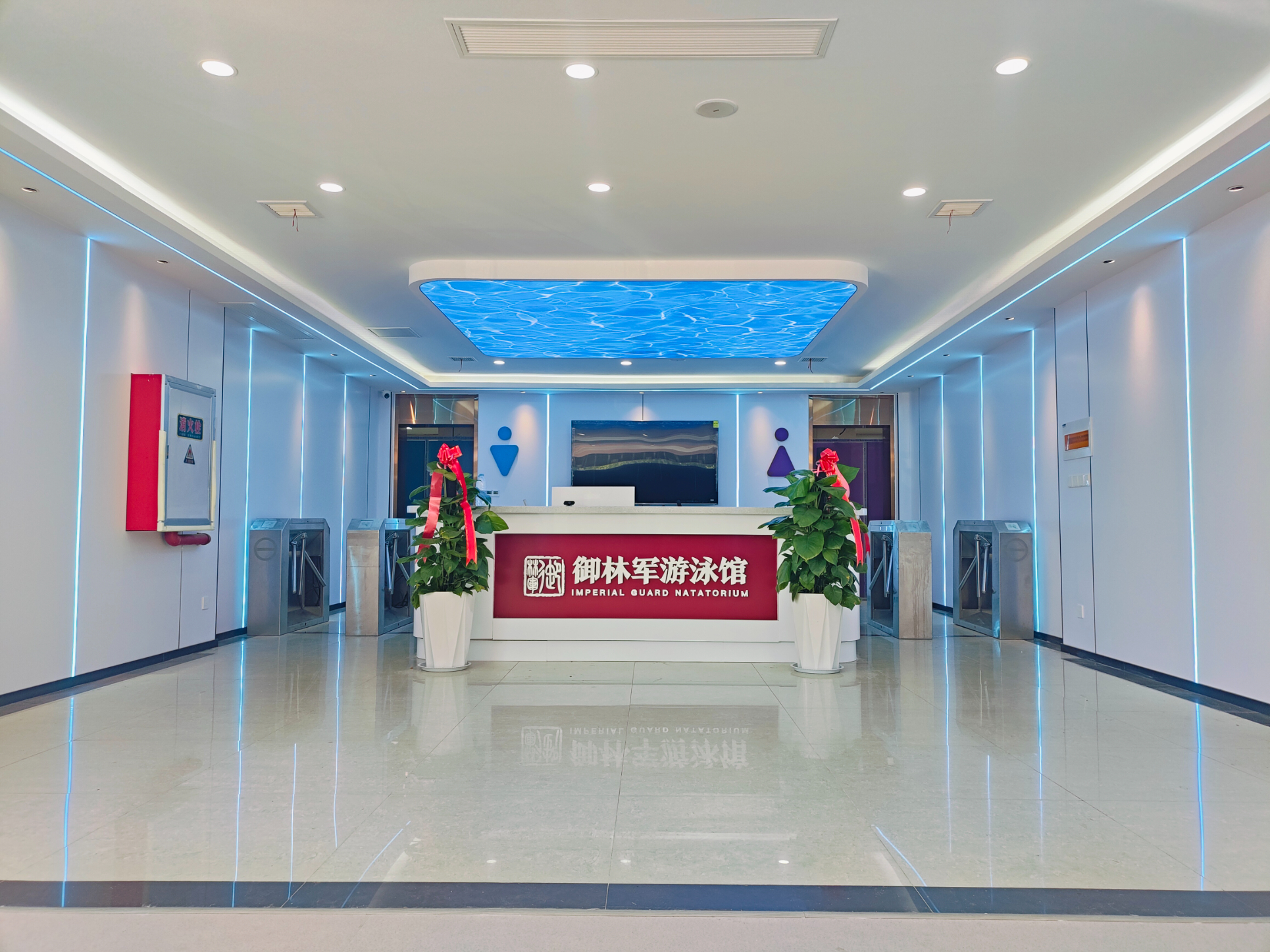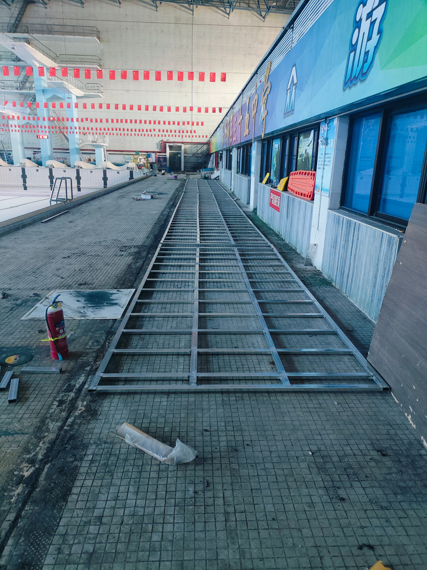 雅努思公司展陳事業部施工人員以嚴謹認真的態度對待此次裝修改造項目!在本次項目中我們對御林軍游泳館的玻璃幕墻、門頭廣告、門廳進行升級改造,男、女更衣室以及對淋浴間整體管線鋪設!原鐵路游泳館建于1995年12月距今30余年,因時間較久淋浴間設施老化已無法滿足現在人們的需求,如管道銹蝕、易積水所以我們對其整個進行管道重新鋪設并做好防水功能!