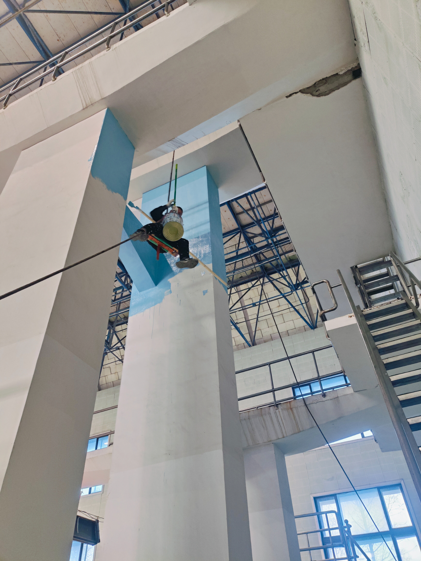 國標泳池跳臺,我們的施工勇士正身著安全繩以墻為紙、以刷為筆、以漆為墨確保安全的情況下,將跳臺刷的完美、漂亮!跳臺以一種全新的視覺面貌展現在眼前!因為場地濕氣大,環境特殊,裝修材料及工藝需考慮防腐蝕性能及防水、防潮性能穩定,不發霉。